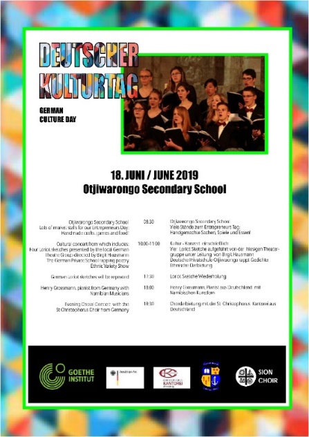 18.Juni Deutscher Kulturtag 17:30 Uhr Konzert in der Aula der Secondary School. Mitwirkung mit dem Schüler-Blechbläserensemble unter Leitung von Henry Großmann. 18:00 Uhr Kammermusik Elifas Sameul (Klarinette) und Henry Großmann (Klavier), anschließend Klavier Solokonzert und Begleitung des Schulchors.